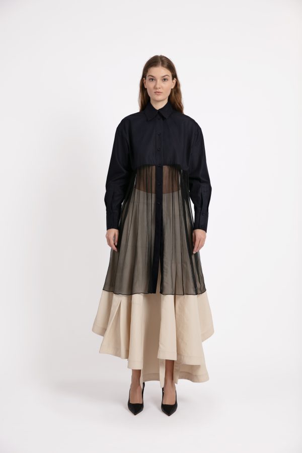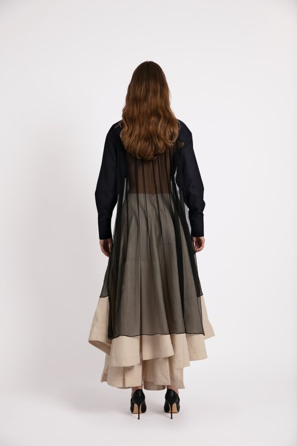 • Camisa negra larga con transparencia a la cintura.