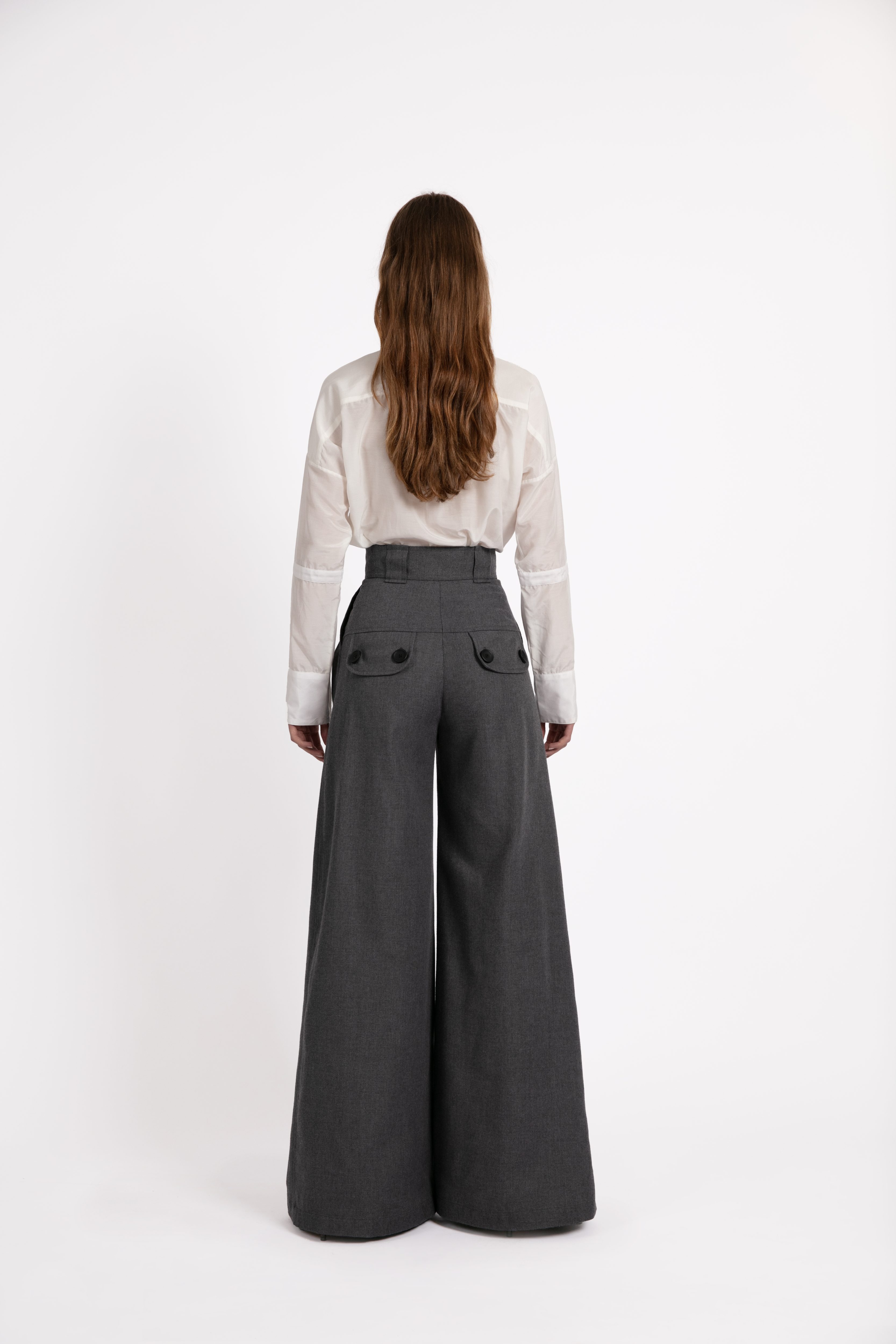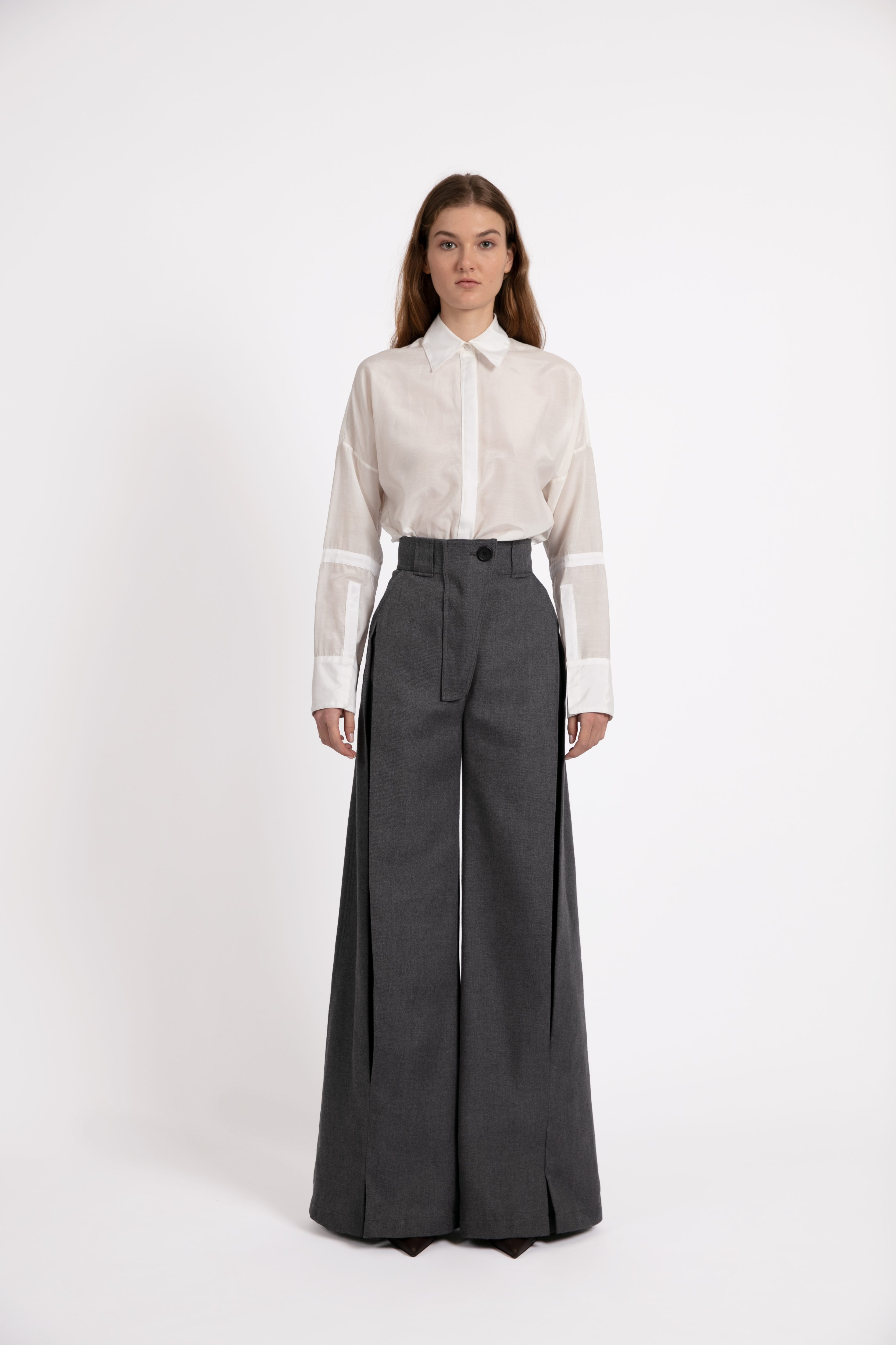 Pantalón corte recto con aberturas en los costados. Pata de elefante. Composición: 65% Poliéster, 35% Viscosa. Cuidados: Lavado en Seco.